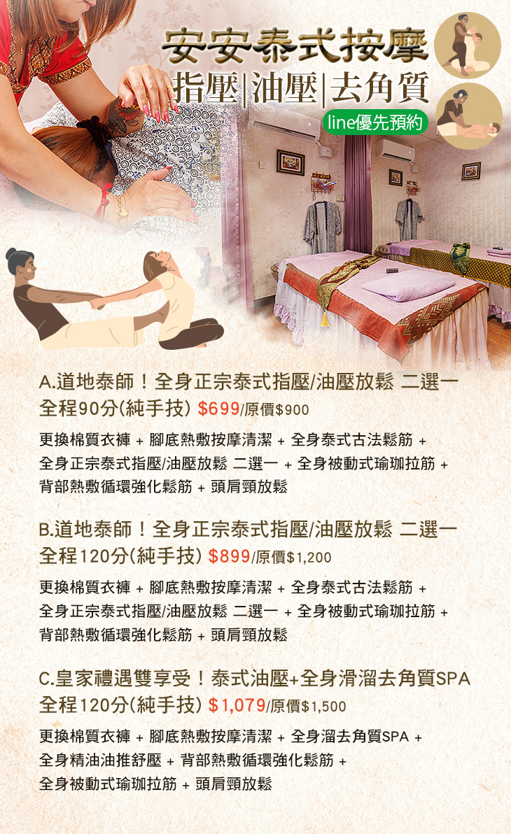 A.道地泰師!全身正宗泰式指壓/油壓放鬆 二選一全程90分(純手技) / B.道地泰師!全身正宗泰式指壓/油壓放鬆 二選一全程120分(純手技) / C.皇家禮遇雙享受!泰式油壓+全身滑溜去角質SPA全程120分(純手技)