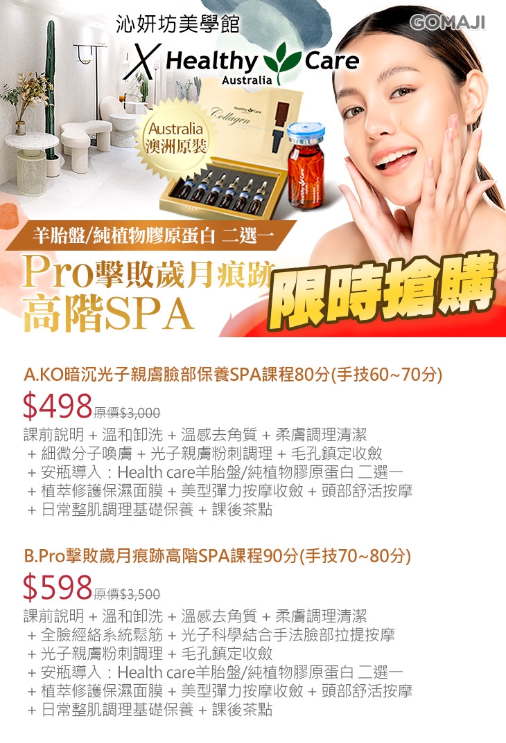 〈課前說明 + 溫和卸洗 + 溫感去角質 + 柔膚調理清潔 + 全臉經絡系統鬆筋 + 光子科學結合手法臉部拉提按摩 + 光子親膚粉刺調理 + 毛孔鎮定收斂 + 安瓶導入:Health care羊胎盤/純植物膠原蛋白 二選一 + 植萃修護保濕面膜 + 美型彈力按摩收斂 + 頭部舒活按摩 + 日常整肌調理基礎保養 + 課後茶點〉