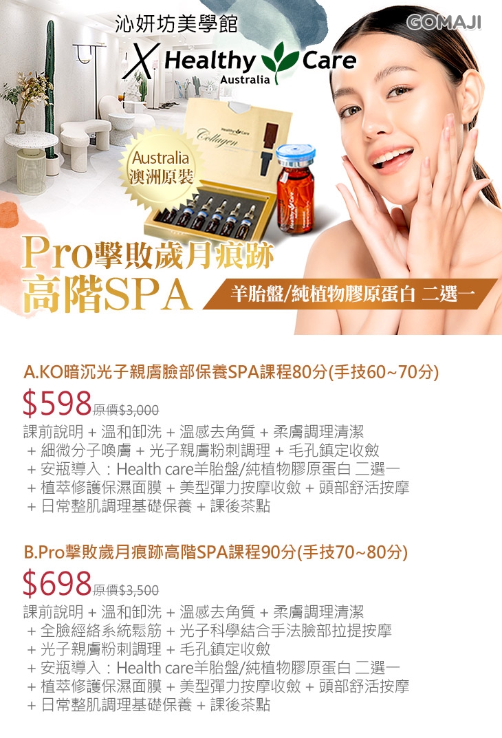 〈課前說明 + 溫和卸洗 + 溫感去角質 + 柔膚調理清潔 + 全臉經絡系統鬆筋 + 光子科學結合手法臉部拉提按摩 + 光子親膚粉刺調理 + 毛孔鎮定收斂 + 安瓶導入:Health care羊胎盤/純植物膠原蛋白 二選一 + 植萃修護保濕面膜 + 美型彈力按摩收斂 + 頭部舒活按摩 + 日常整肌調理基礎保養 + 課後茶點〉