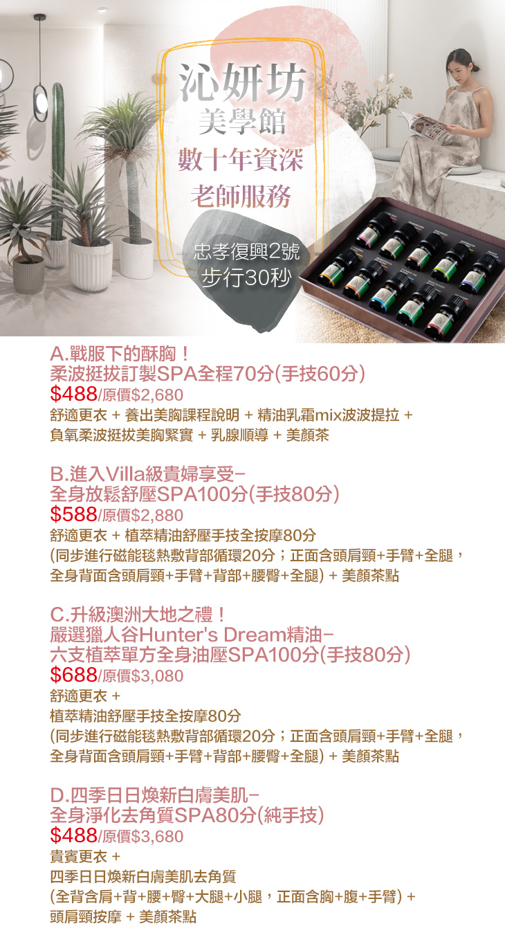 A.戰服下的酥胸!柔波挺拔訂製SPA全程70分(手技60分) / B.進入Villa級貴婦享受-全身放鬆舒壓SPA100分(手技80分) / C.升級澳洲大地之禮!嚴選獵人谷Hunter's Dream精油-六支植萃單方全身油壓SPA100分(手技80分) / D.四季日日煥新白膚美肌-全身淨化去角質SPA80分(純手技)