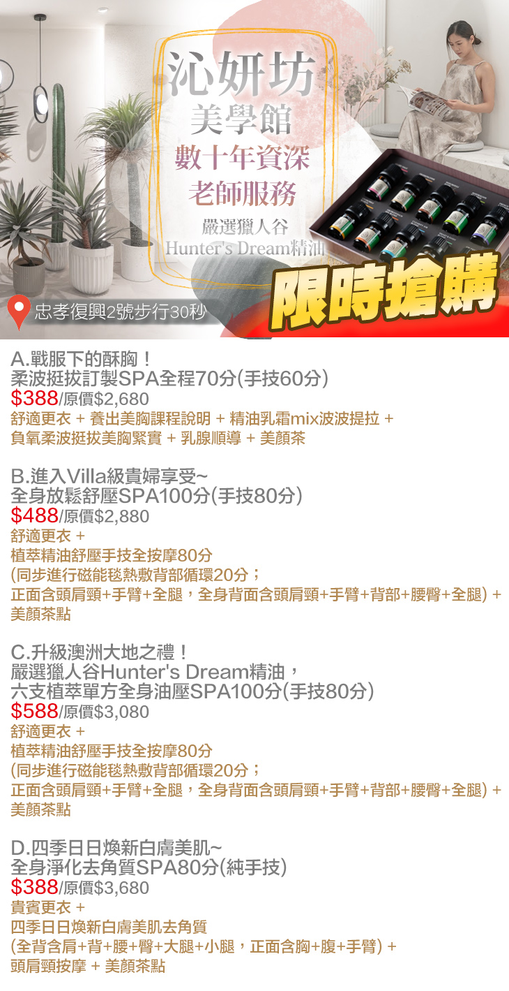 A.戰服下的酥胸!柔波挺拔訂製SPA全程70分(手技60分) / B.進入Villa級貴婦享受~全身放鬆舒壓SPA100分(手技80分) / C.升級澳洲大地之禮!嚴選獵人谷Hunter's Dream精油,六支植萃單方全身油壓SPA100分(手技80分) / D.四季日日煥新白膚美肌~全身淨化去角質SPA80分(純手技)