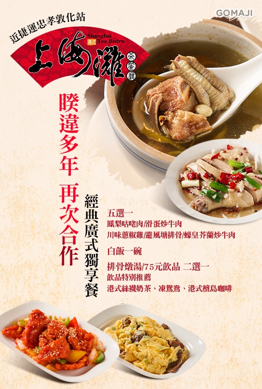 位在台北東區,典雅的燈光再現上海灘的慵懶風情,店家招牌的港式料理,大受許多年輕人歡迎,道地美味讓麻吉們不用飛出國就能享用!