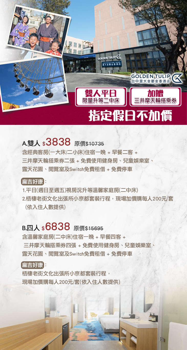 ★ 女神春遊趣,雙人平日視房況升等溫馨家庭房(二中床)/四人住宿,專案含早餐及三井摩天輪券,輕鬆入住台中海線首家國際品牌酒店!
