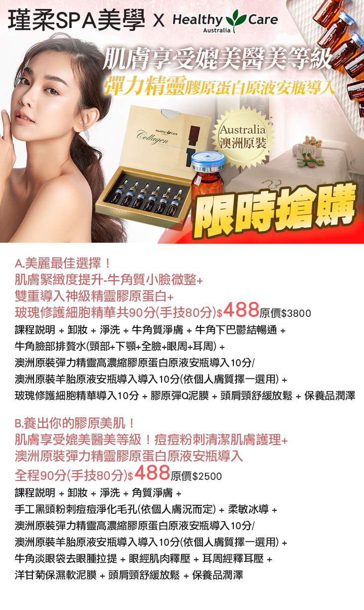 B.養出你的膠原美肌!肌膚享受媲美醫美等級!痘痘粉刺清潔肌膚護理+澳洲原裝彈力精靈膠原蛋白原液安瓶導入全程90分(手技80分)