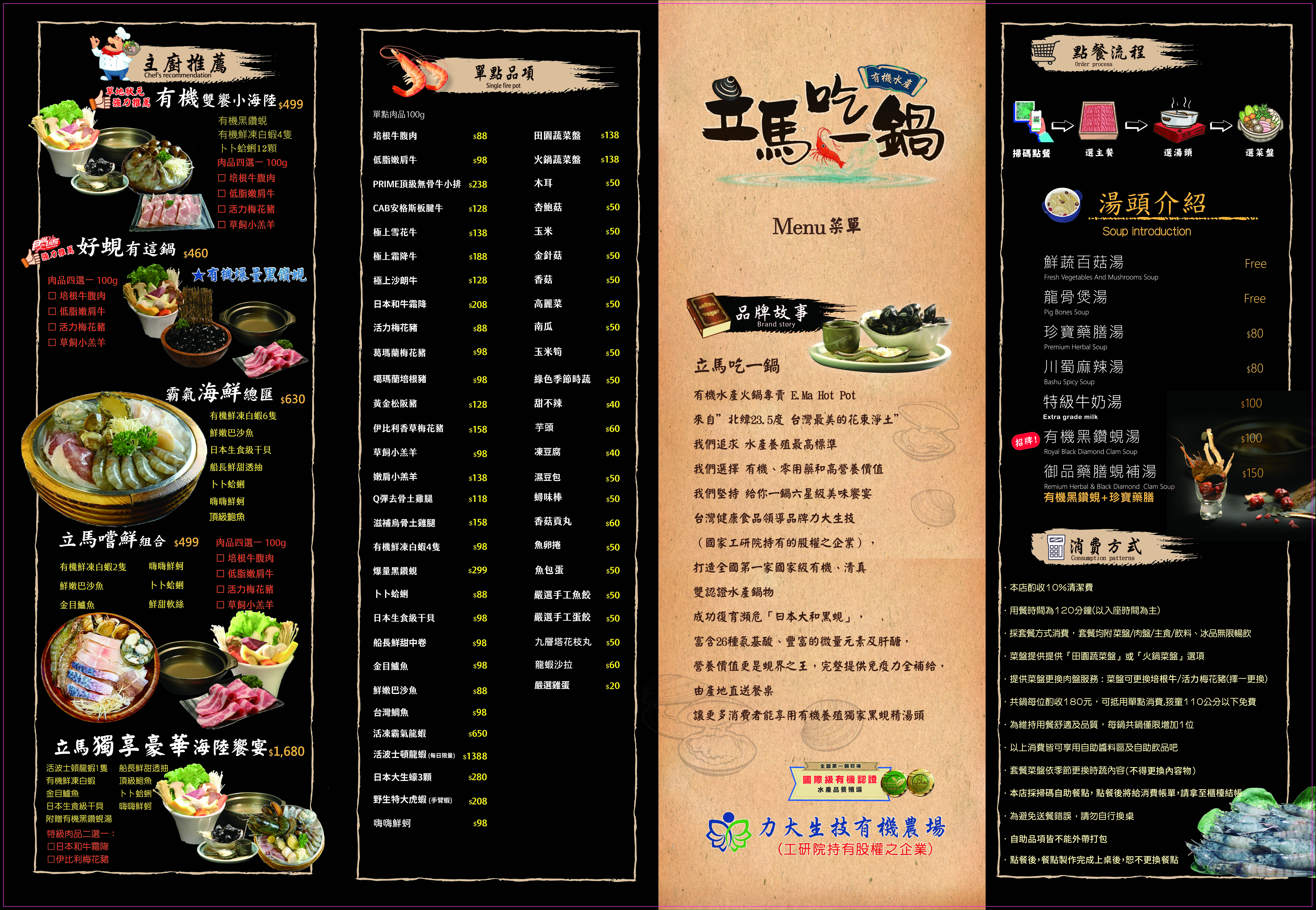 【立馬吃一鍋,有機水產鍋物】擁有自己的水產養殖場,所有的養殖過程,皆遵循有機系統,其養殖出來的水產,品質純淨,給予消費者食安上的承諾。說到有機水產,便不能不提到有機三寶-招牌日本黑蜆、有機無刺的虱目魚與白蝦,良好的品質,在鍋湯中不斷燉煮,自然、甘醇、鮮甜的美味,滲入滴滴湯水當中,創造韻味無窮的湯底,保證讓您一嚐驚艷、夜夜難忘、回味無窮!