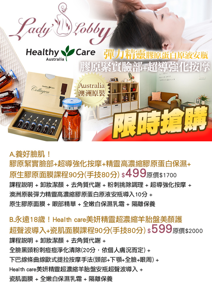 B.永遠18歲!Health care美妍精靈超濃縮羊胎盤美顏護超聲波導入+瓷肌面膜課程90分(手技80分)