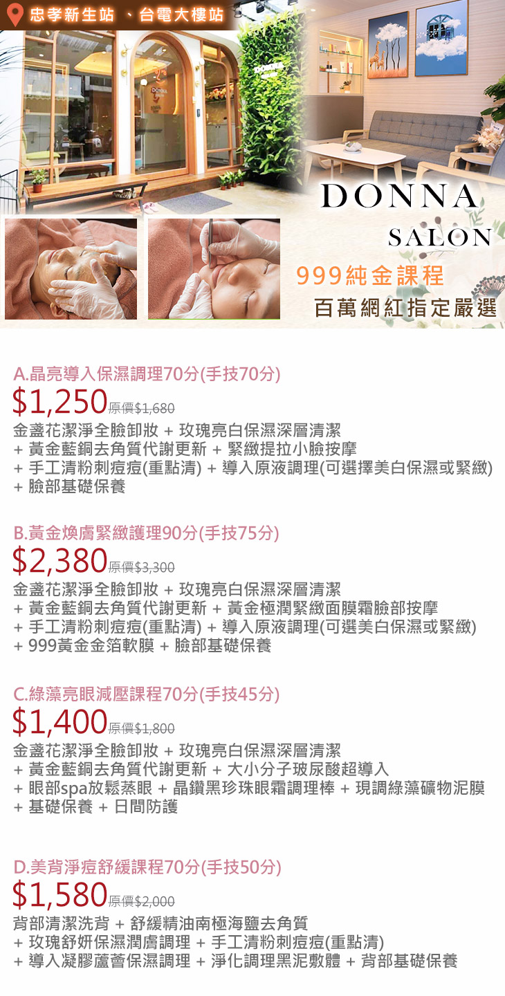 A.晶亮導入保濕調理70分(手技70分) / B.黃金煥膚緊緻護理90分(手技75分) / C.綠藻亮眼減壓課程70分(手技45分) / D.美背淨痘舒緩課程70分(手技50分)