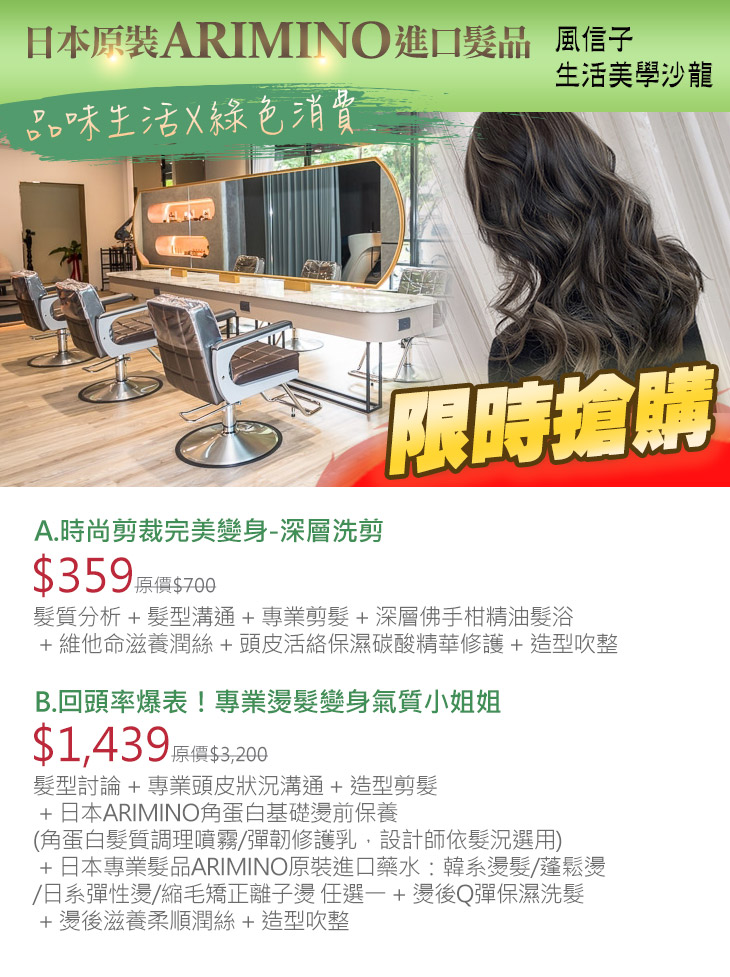 〈髮型討論 + 專業頭皮狀況溝通 + 造型剪髮 + 日本ARIMINO角蛋白基礎燙前保養(角蛋白髮質調理噴霧/彈韌修護乳,設計師依髮況選用) + 日本專業髮品ARIMINO原裝進口藥水:韓系燙髮/蓬鬆燙/日系彈性燙/縮毛矯正離子燙 任選一 + 燙後Q彈保濕洗髮 + 燙後滋養柔順潤絲 + 造型吹整〉