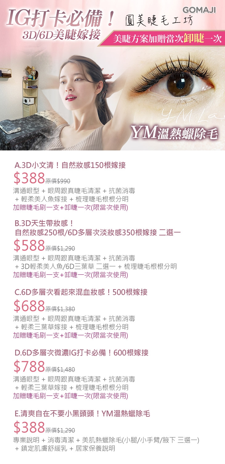 A.3D小文清!自然妝感150根嫁接 / B.3D天生帶妝感!自然妝感250根/6D多層次淡妝感350根嫁接 二選一 / C.6D多層次看起來混血妝感!500根嫁接 / D.6D多層次微濃IG打卡必備!600根嫁接 / E.清爽自在不要小黑頭頭!YM溫熱蠟除毛