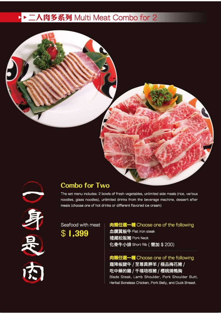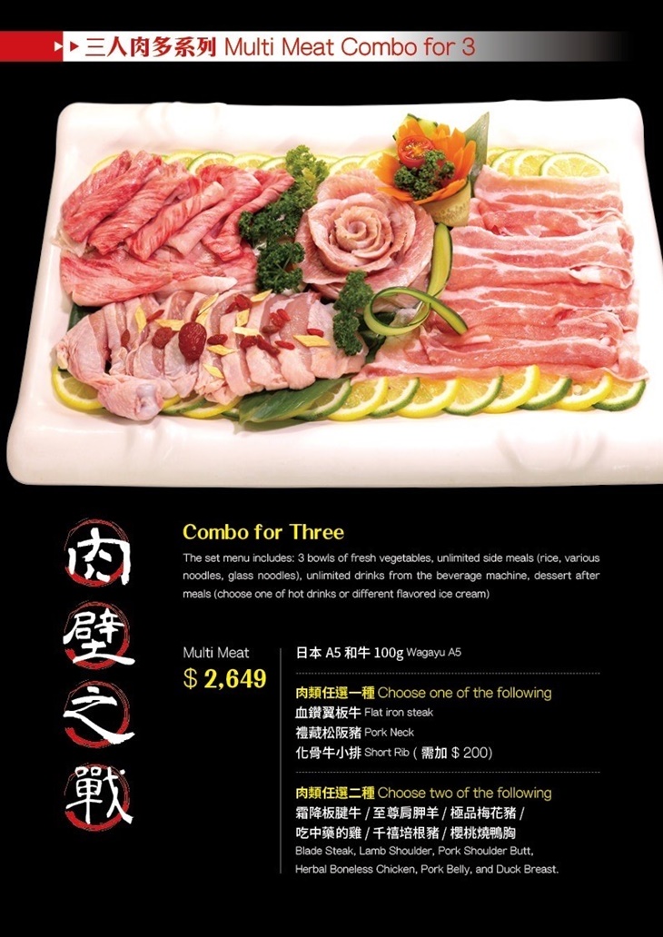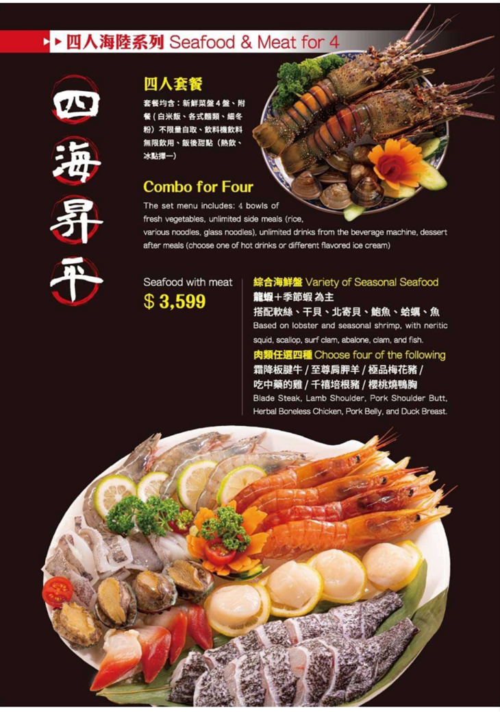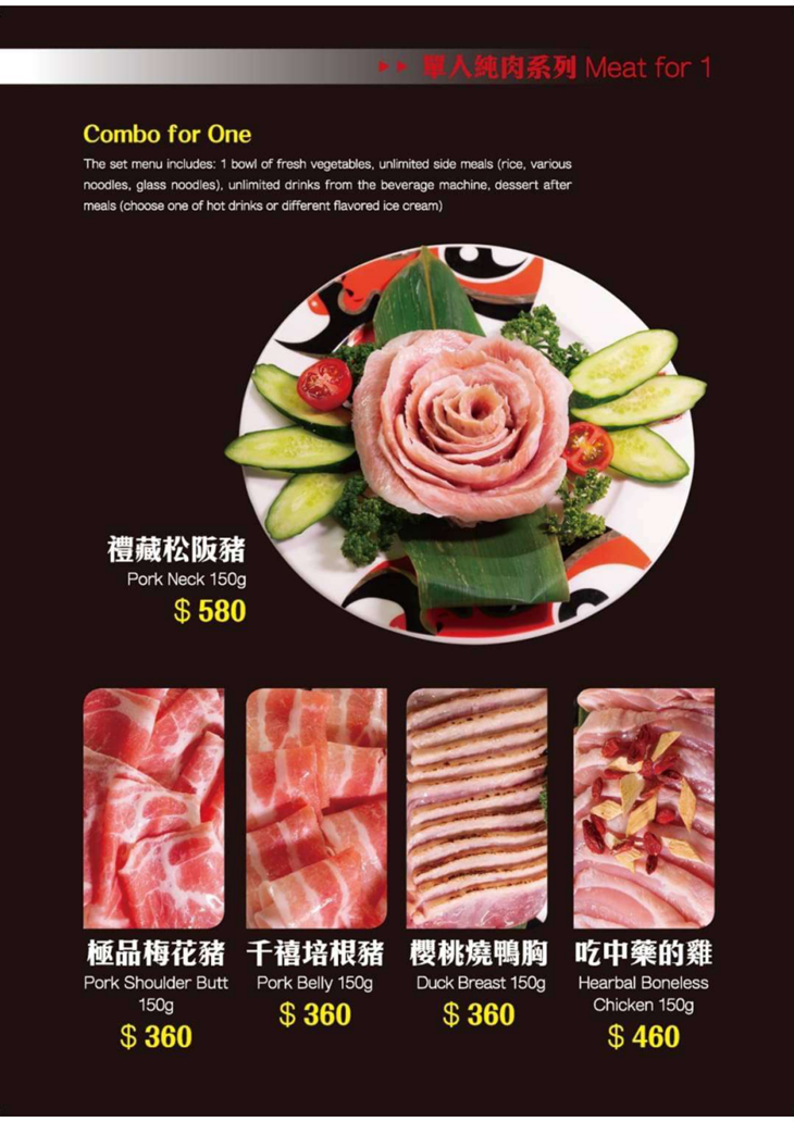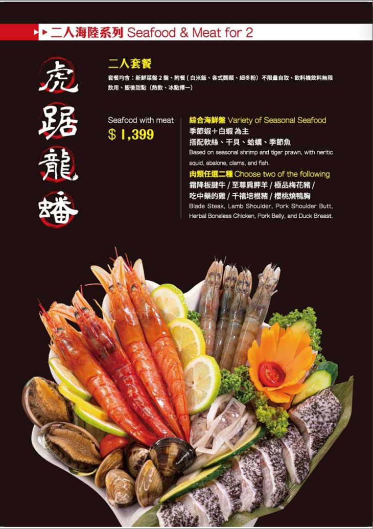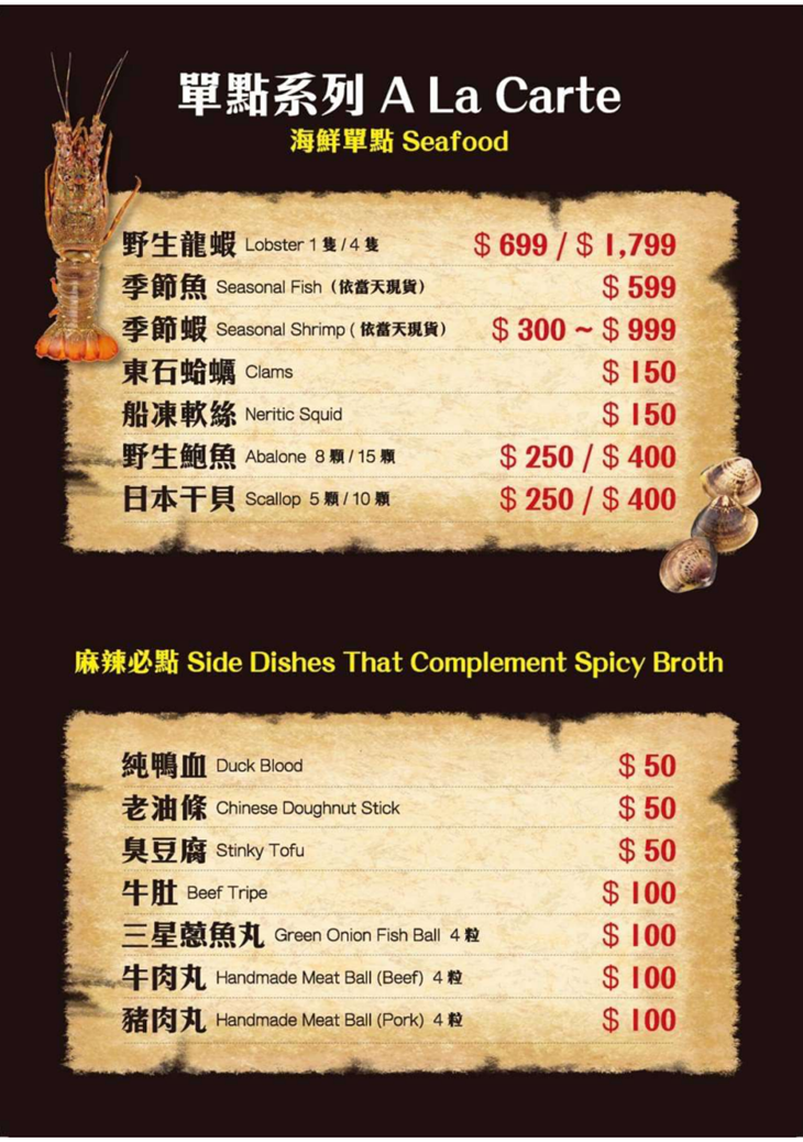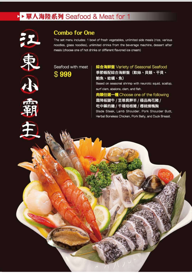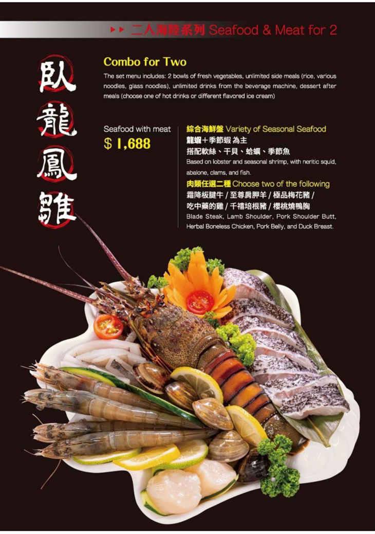 有嫩肉、有海鮮,超澎湃的組合,保證您吃過一次就難忘!選用新鮮肥美的龍蝦,緊緻的肉質、彈牙的肉質、飽滿且鮮甜,每口咀嚼都嚐得到迷人海味,搭配各式海鮮食材、肉片一同涮煮,使溫潤湯頭多了一分鮮甜,好喝又暖胃!