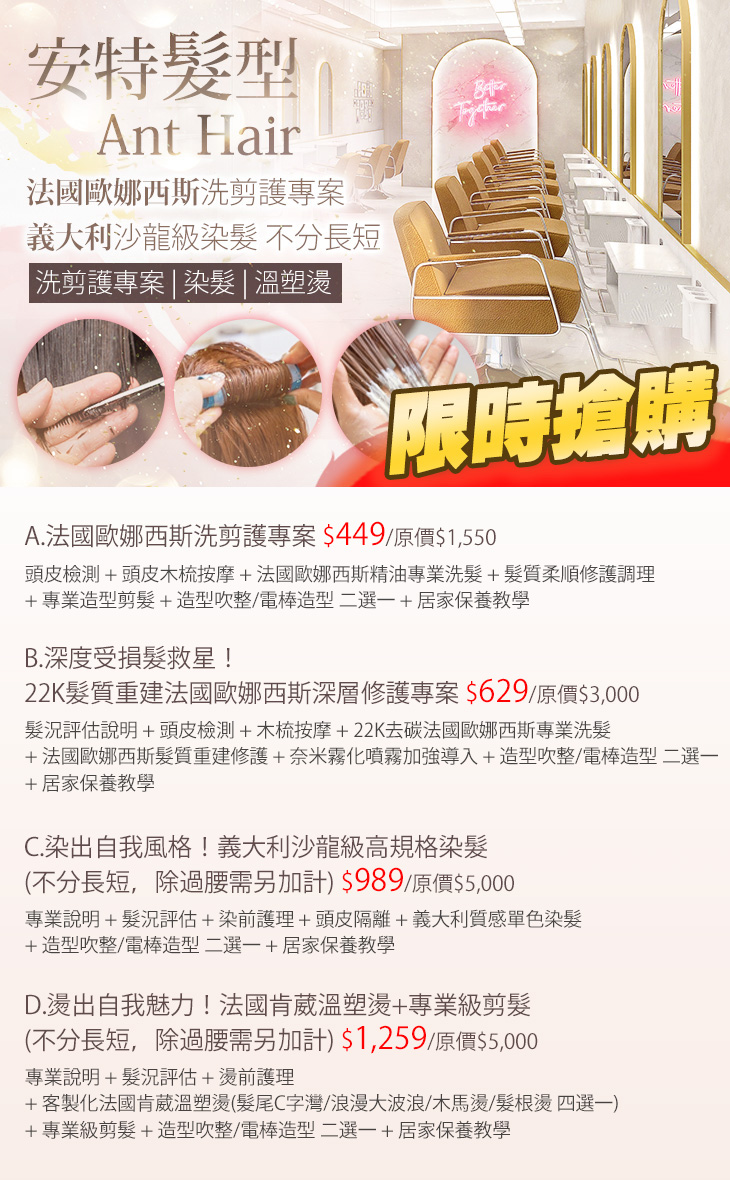 A.法國歐娜西斯洗剪護專案 / B.深度受損髮救星!22K髮質重建法國歐娜西斯深層修護專案 / C.染出自我風格!義大利沙龍級高規格染髮(不分長短,除過腰需另加計) / D.燙出自我魅力!法國肯葳溫塑燙+專業級剪髮(不分長短,除過腰需另加計)