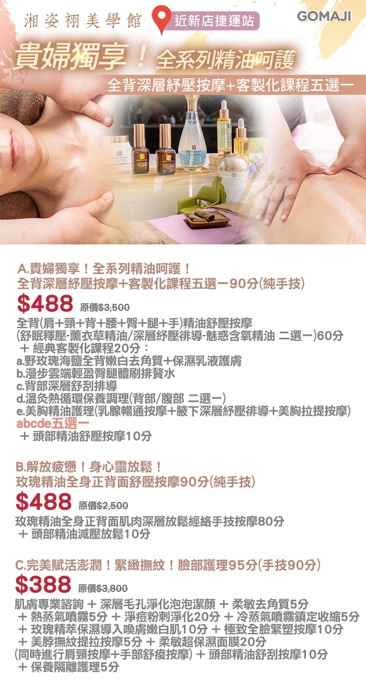 A.貴婦獨享!全系列精油呵護!全背深層紓壓按摩+客製化課程五選一90分(純手技) / B.解放疲憊!身心靈放鬆!玫瑰精油全身正背面舒壓按摩90分(純手技) / C.完美賦活澎潤!緊緻撫紋!臉部護理95分(手技90分)