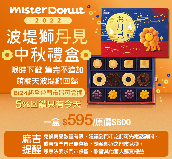 Mister Donut中秋特別獻禮~以日式甜甜圈專賣店精神承襲日本菓子的桃山工藝,結合本土經典食材及時令水果,精心推出最貼近大小朋友口味的甜蜜組合「波堤獅月見中秋禮盒」,為敲碗已久的粉絲們奉上超可愛波堤獅造型桃山月餅,禮盒外包裝也同樣以超Q代言人波堤獅進行設計,延續品牌日式典雅風格,無論自用、送禮都很有面子,可愛程度直逼心臟爆擊,讓Mister Donut於中秋佳節為您帶來最卡哇伊的中秋祝福!