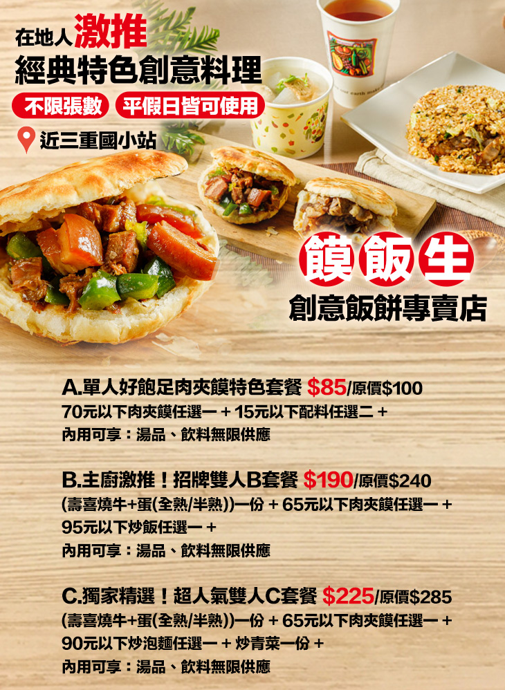 座落在新北市,鄰近於三重國小站的《饃飯生創意飯餅專賣店》,推出CP值和美味兼具的各式創意料理而贏得在地人的大力推崇,並以肉夾饃及特色炒飯為主打商品。源自於中國陝西的肉夾饃即為古漢語「肉夾于饃」之簡稱,是觀光客每每到訪必吃的在地美饌,主廚將老潼關肉夾饃加以改良,豐盈的口感配上精心研創的多種口味,每一口都將帶給您最佳的味覺享受,內用還可享湯品及飲料無限量供應喔~麻吉們快來品嚐這份驚豔眾人的傳統美味吧!