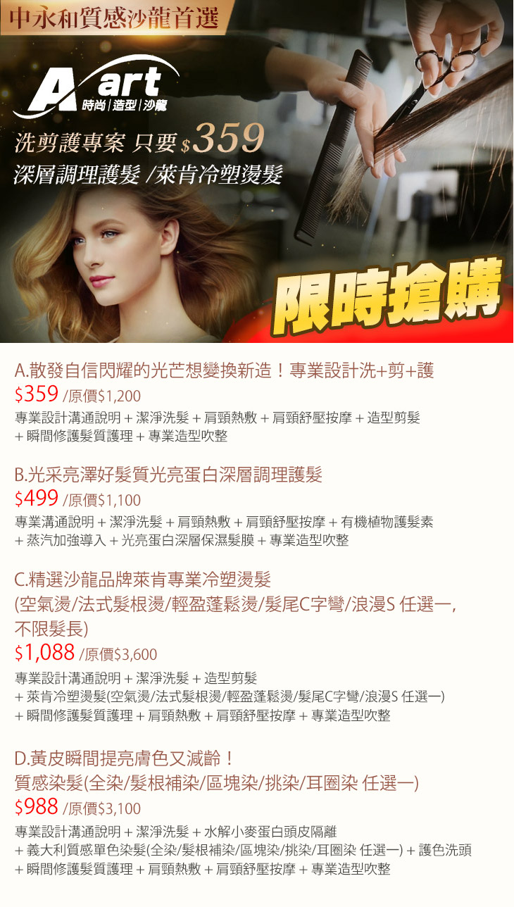 A.散發自信閃耀的光芒想變換新造!專業設計洗+剪+護 / B.光采亮澤好髮質光亮蛋白深層調理護髮 / C.精選沙龍品牌萊肯專業冷塑燙髮(空氣燙/法式髮根燙/輕盈蓬鬆燙/髮尾C字彎/浪漫S 任選一,不限髮長) / D.黃皮瞬間提亮膚色又減齡!質感染髮(全染/髮根補染/區塊染/挑染/耳圈染 任選一)