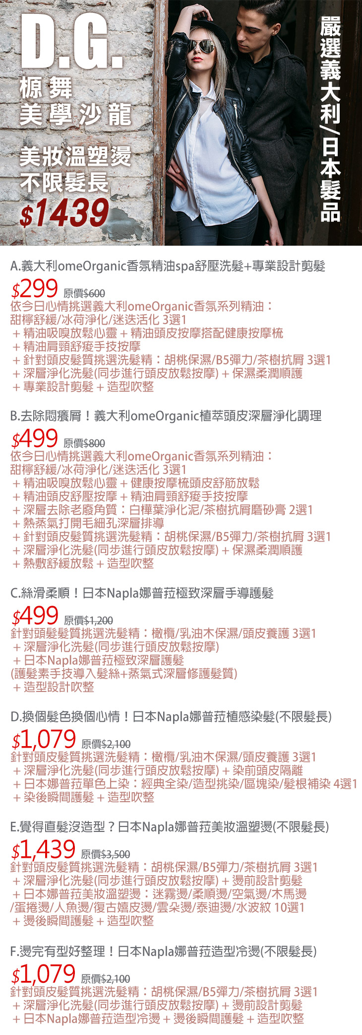 A.義大利omeOrganic香氛精油spa舒壓洗髮+專業設計剪髮 / B.去除悶癢屑!義大利omeOrganic植萃頭皮深層淨化調理 / C.絲滑柔順!日本Napla娜普菈極致深層手導護髮 / D.換個髮色換個心情!日本Napla娜普菈植感染髮(不限髮長) / E.覺得直髮沒造型?日本Napla娜普菈美妝溫塑燙(不限髮長) / F.燙完有型好整理!日本Napla娜普菈造型冷燙(不限髮長)