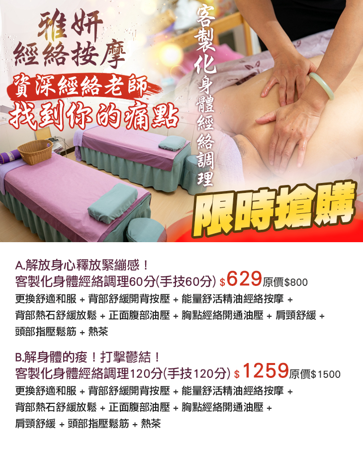A.解放身心釋放緊繃感!客製化身體經絡調理60分(手技60分)