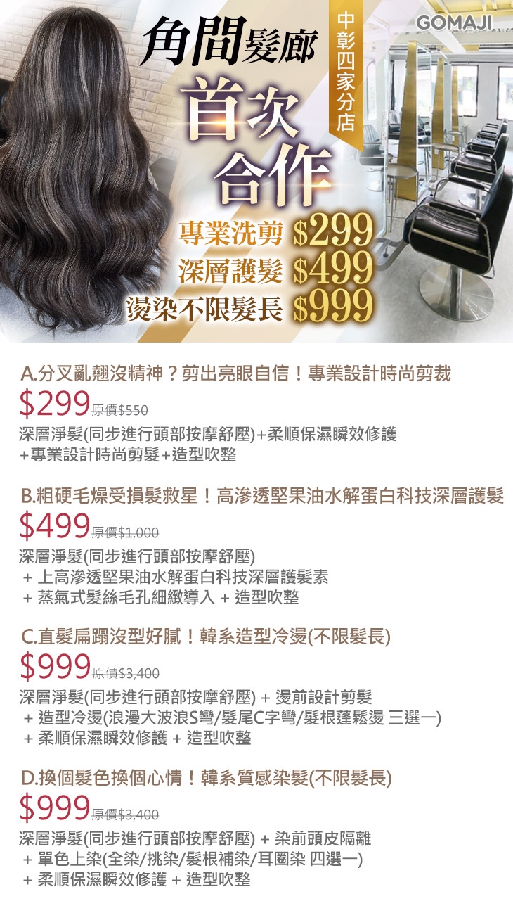 A.分叉亂翹沒精神?剪出亮眼自信!專業設計時尚剪裁 / B.粗硬毛燥受損髮救星!高滲透堅果油水解蛋白科技深層護髮 / C.直髮扁蹋沒型好膩!韓系造型冷燙(不限髮長) / D.換個髮色換個心情!韓系質感染髮(不限髮長)