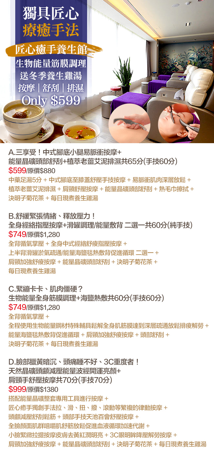 A.三享受!中式腳底小腿易脈衝按摩+能量晶礦頭部舒刮+植萃老薑艾泥排濕共65分(手技60分) / B.舒緩緊張情緒、釋放壓力!全身經絡指壓按摩+滑罐調理/能量敷背 二選一共60分(純手技) / C.緊繃卡卡、肌肉僵硬?生物能量全身筋膜調理+海鹽熱敷共60分(手技60分) / D.臉部臘黃暗沉、頭痛睡不好、3C重度者!天然晶礦頭顱減壓能量波經開運亮顏+肩頸手舒壓按摩共70分(手技70分)