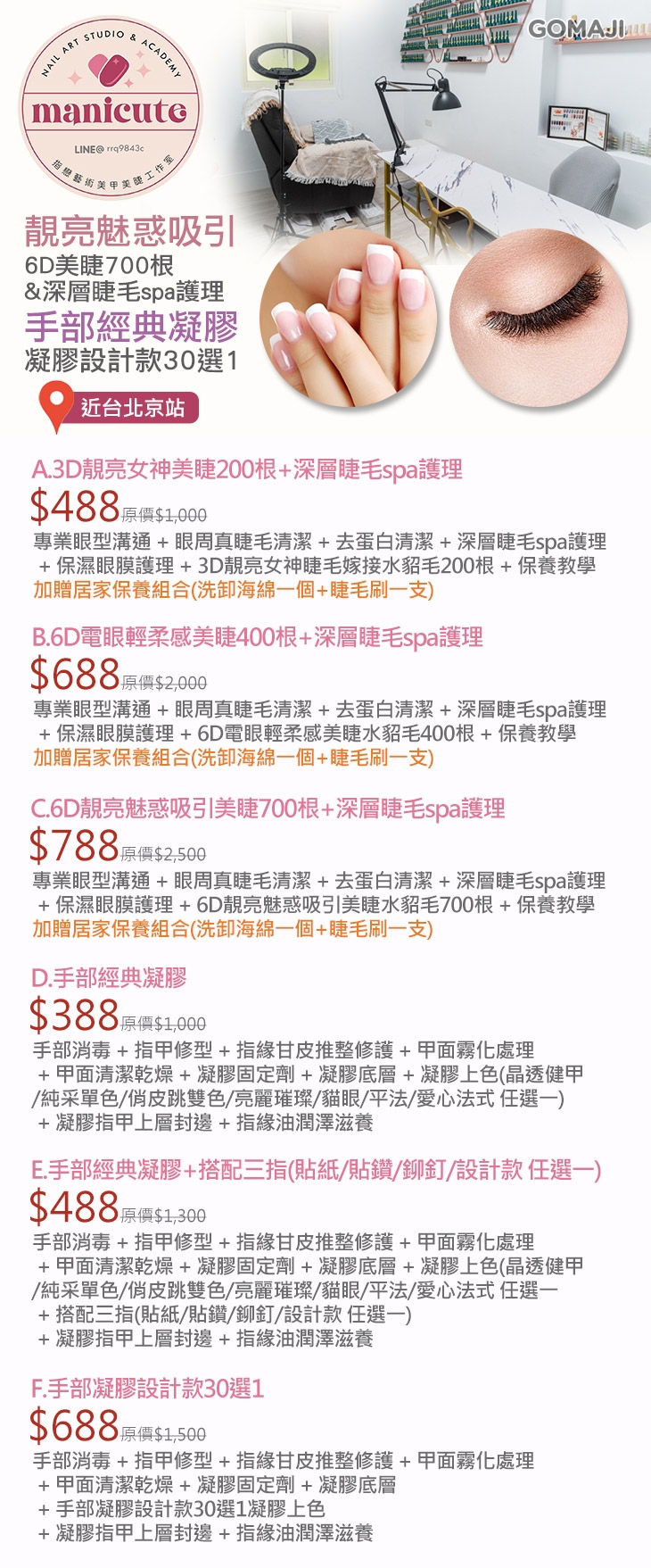 A.3D靚亮女神美睫200根+深層睫毛spa護理 / B.6D電眼輕柔感美睫400根+深層睫毛spa護理 / C.6D靚亮魅惑吸引美睫700根+深層睫毛spa護理 / D.手部經典凝膠 / E.手部經典凝膠+搭配三指(貼紙/貼鑽/鉚釘/設計款 任選一) / F.手部凝膠設計款30選1