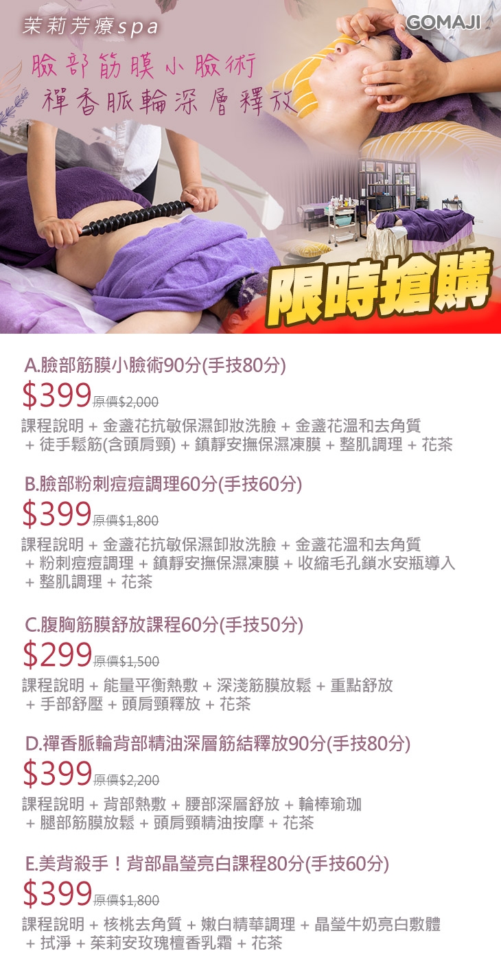 A.臉部筋膜小臉術90分(手技80分) / B.臉部粉刺痘痘調理60分(手技60分) / C.腹胸筋膜舒放課程60分(手技50分) / D.禪香脈輪背部精油深層筋結釋放90分(手技80分) / E.美背殺手!背部晶瑩亮白課程80分(手技60分)