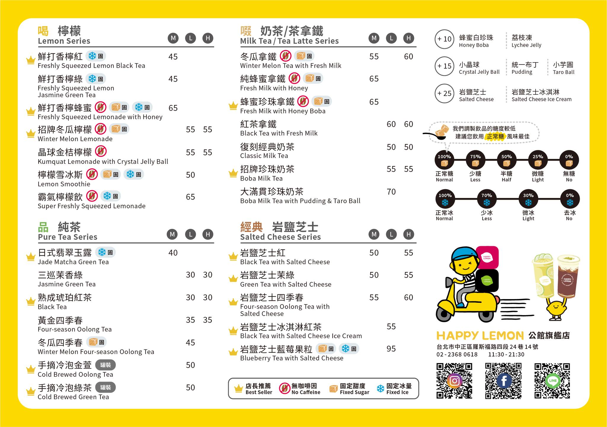 【快樂檸檬Happylemon】秉持著品牌的「5G精神」-Good People、Good Service、Good Product、Good Logistic、Good Eco-system,堅持嚴選用料,將好茶結合鮮果、鮮奶、鮮料,調和出膾炙人口的飲品,並透過這一杯又一杯的創作茶飲,為您我帶來快樂。