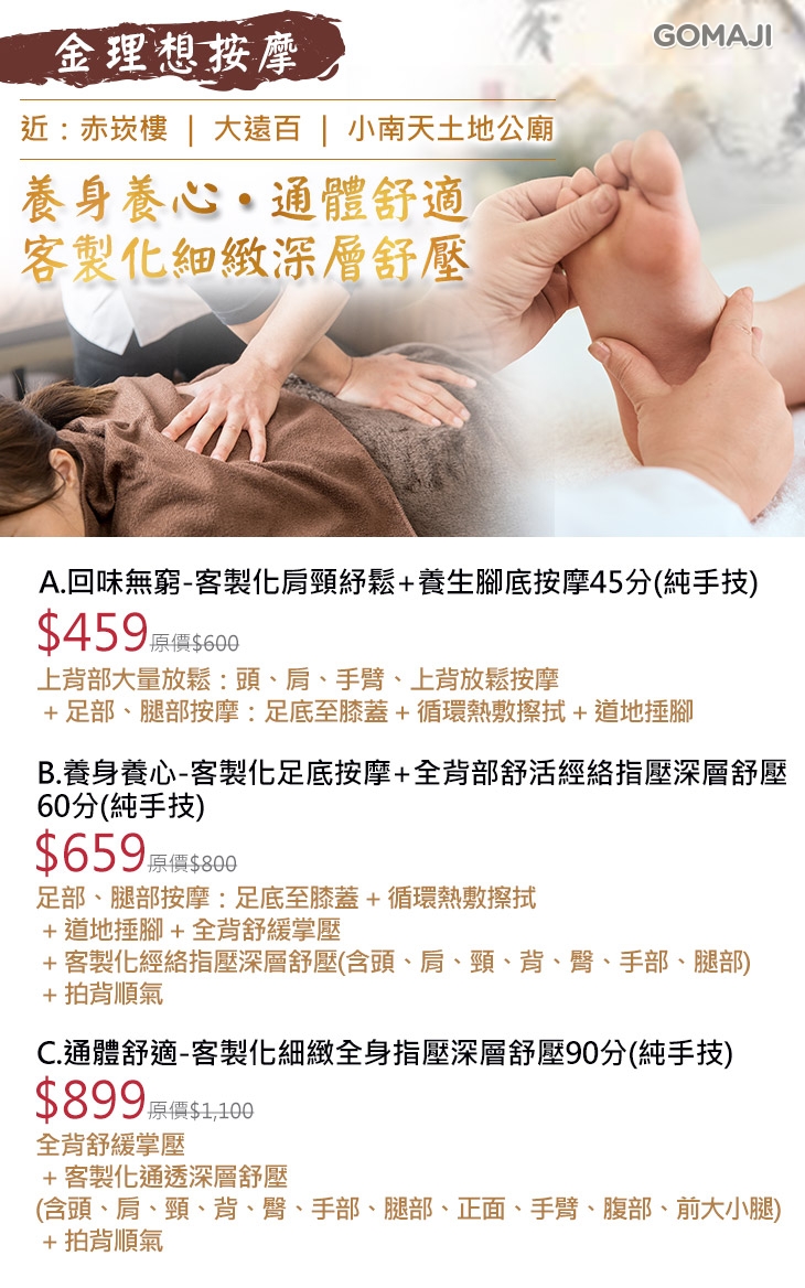 A.回味無窮-客製化肩頸紓鬆+養生腳底按摩45分(純手技) / B.養身養心-客製化足底按摩+全背部舒活經絡指壓深層舒壓60分(純手技) / C.通體舒適-客製化細緻全身指壓深層舒壓90分(純手技)