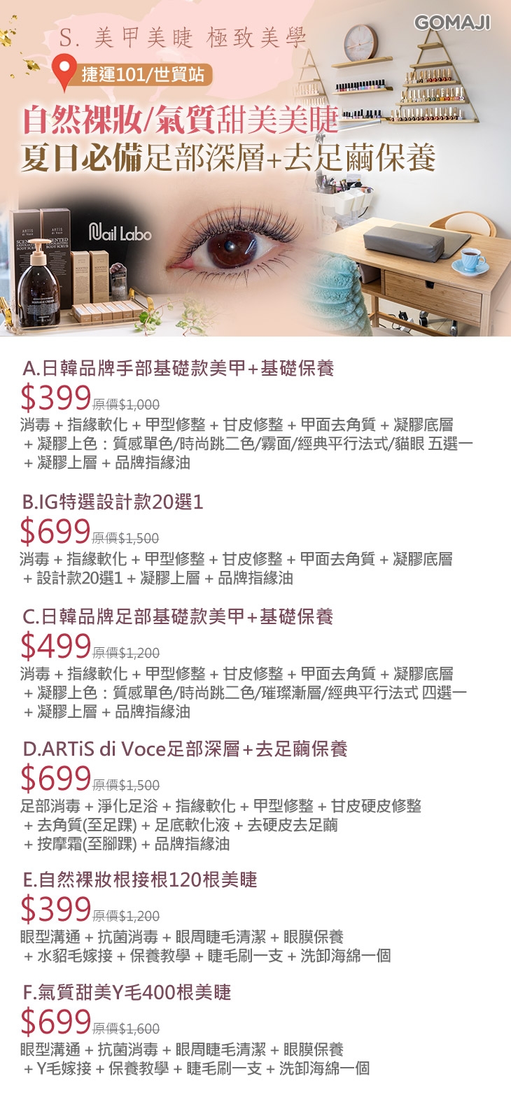 A.日韓品牌手部基礎款美甲+基礎保養 / B.IG特選設計款20選1 / C.日韓品牌足部基礎款美甲+基礎保養 / D.ARTiS di Voce足部深層+去足繭保養 / E.自然裸妝根接根120根美睫 / F.氣質甜美Y毛400根美睫