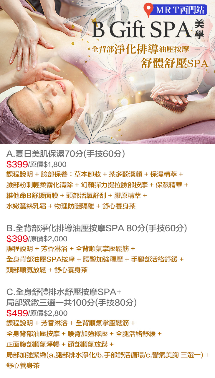 A.夏日美肌保濕70分(手技60分) / B.全背部淨化排導油壓按摩SPA 80分(手技60分) / C.全身舒體排水舒壓按摩SPA+局部緊緻三選一共100分(手技80分)