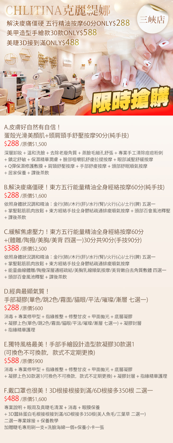 A.皮膚好自然有自信!蛋殼光滑美顏肌+頭肩頸手舒壓按摩90分(純手技)/B.解決痠痛僵硬!東方五行能量精油全身經絡按摩60分(純手技)/C.緩解焦慮壓力!東方五行能量精油全身經絡按摩60分+(體雕/陶撥/美胸/美背 四選一)30分共90分(手技90分)/D.手部凝膠(單色/跳2色/霧面/貓眼/平法/璀璨/漸層 七選一)/E.手部手繪設計造型款凝膠30款選1(可換色不可換款,款式不定期更換)/F.3D根接根接到滿/6D根接多350根 二選一