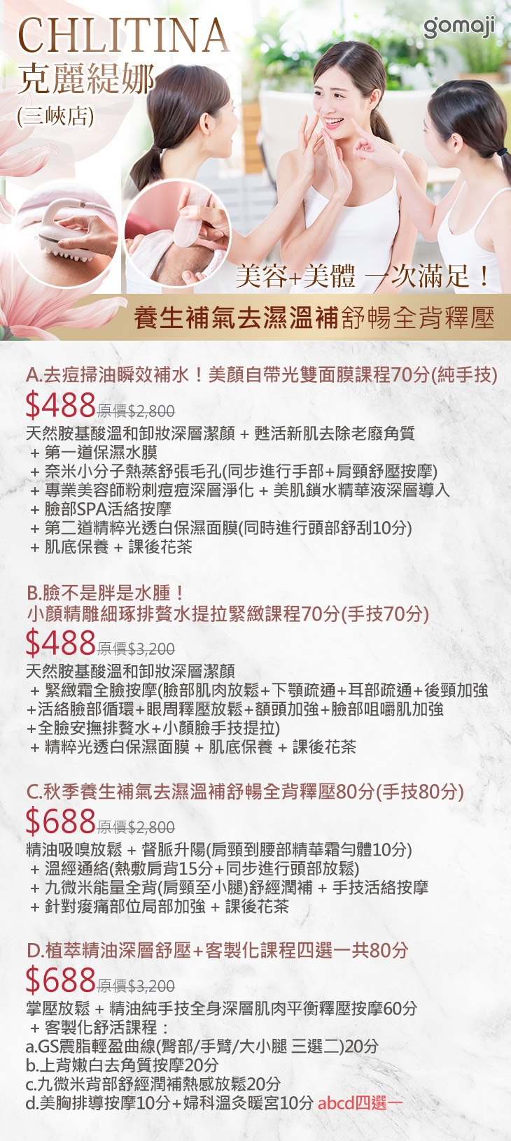 A.去痘掃油瞬效補水!美顏自帶光雙面膜課程70分(純手技) / B.臉不是胖是水腫!小顏精雕細琢排贅水提拉緊緻課程70分(手技70分) / C.秋季養生補氣去濕溫補舒暢全背釋壓80分(手技80分) / D.植萃精油深層舒壓+客製化課程四選一共80分