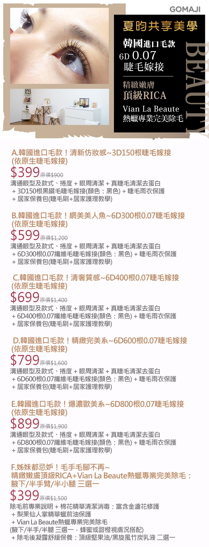 A.韓國進口毛款!清新仿妝感~3D150根睫毛嫁接 / B.韓國進口毛款!網美美人魚~6D300根0.07睫毛嫁接 / C.韓國進口毛款!清奢質感~6D400根0.07睫毛嫁接 / D.韓國進口毛款!精緻完美系~6D600根0.07睫毛嫁接 / E.韓國進口毛款!爆濃歐美系~6D800根0.07睫毛嫁接 / F.姊妹都忌妒!毛手毛腳不再~精緻嫩膚頂級RICA+Vian La Beaute熱蠟專業完美除毛:腋下/半手臂/半小腿 三選一