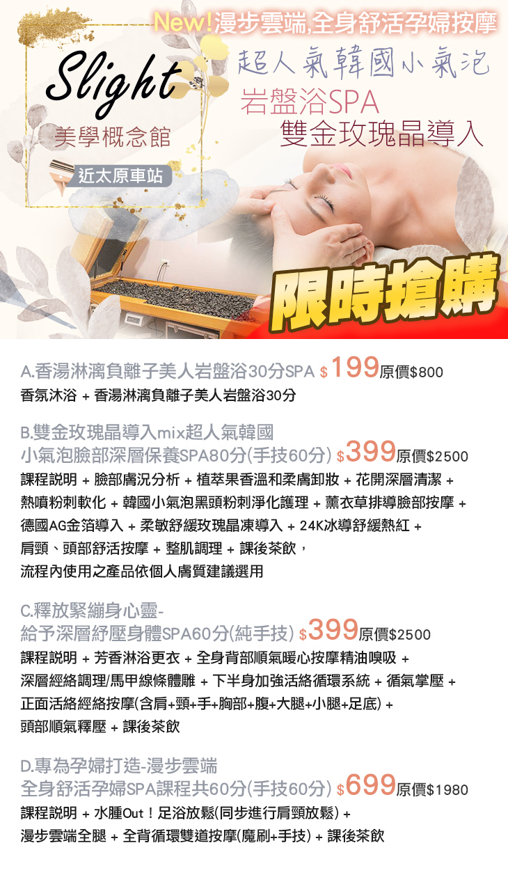 A.香湯淋漓負離子美人岩盤浴30分SPA / B.雙金玫瑰晶導入mix超人氣韓國小氣泡臉部深層保養SPA80分(手技60分) / C.釋放緊繃身心靈-給予深層紓壓身體SPA60分(純手技) / D.專為孕婦打造-漫步雲端全身舒活孕婦SPA課程共60分(手技60分)