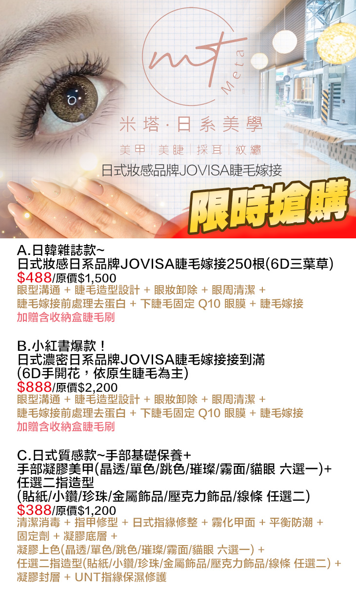 無論是喜歡清純感的女孩,或是嚮往濃密妝感的女孩,都能依照妳的眼型設計出最美的樣子唷!精心挑選日系品牌-JOVISE的睫毛,質感輕盈而富有彈性,如羽毛般的柔軟觸感,銜接在真睫毛根部上也不會感到有負擔,宛如天生一般,自然捲翹、靈動迷人,眨眨眼就散發無限電力!