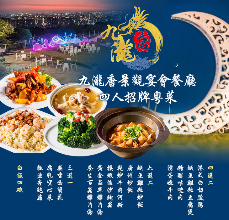 〈港式白切臘腸/鹹魚雞粒豆腐煲/糖醋咕咾肉/滑蛋嫩牛肉 四選二 + 鹹魚雞粒炒飯/廣州炒飯/乾炒牛肉河粉/櫻蝦流沙鮑菇/黃金蟲草雞片湯/養生百菇雞片湯 六選二 + 蒜香西蘭花/腐乳空心菜/椒鹽杏鮑菇 三選一 + 白飯四碗〉