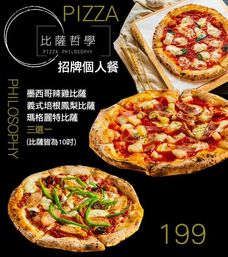 座落在台中市的西區,《比薩哲學》秉持著經典至上的理念,嚴選義大利當地的優質原料、沿襲義大利Accademia Pizzaioli的專業比薩技藝,結合完美比例的配方,為顧客帶來有別於美式連鎖比薩的全新體驗。此次特別推出三種人氣口味的個人比薩任您挑選,您可在優美典雅、舒適靜謐的環境裡慢慢享用,亦可帶回家中悉心感受正統比薩的美味精髓,只需一口,便如同親臨義國,這場獨特的風味饗宴又豈能輕易錯過,即刻前往品嚐一番吧!