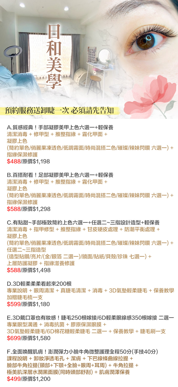 E.3D戴口罩也有妝感!睫毛250根嫁接/6D輕柔眼線感350根嫁接 二選一