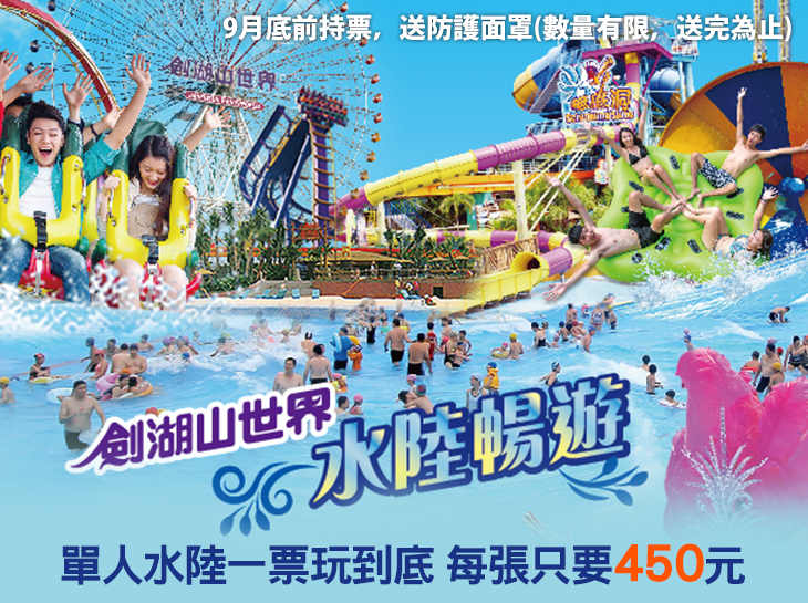 單人水陸一票玩到底,麻吉好康:凡於2021/9/30前持GOMAJI購買的劍湖山門票,即可獲得防護面罩(數量有限,送完為止)