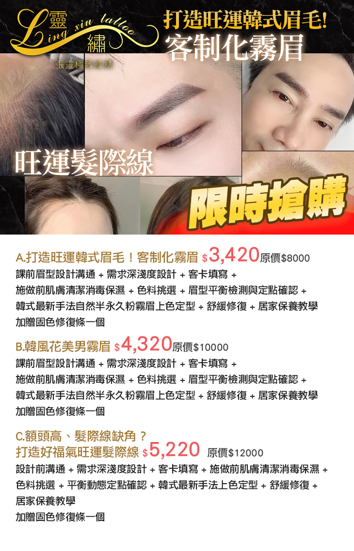 〈設計前溝通 + 需求深淺度設計 + 客卡填寫 + 施做前肌膚清潔消毒保濕 + 色料挑選 + 平衡動態定點確認 + 韓式最新手法上色定型 + 舒緩修復 + 居家保養教學〉加贈固色修復條一個
