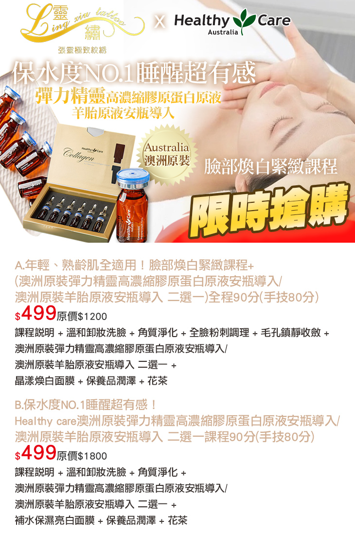 B.保水度NO.1睡醒超有感!Healthy care澳洲原裝彈力精靈高濃縮膠原蛋白原液安瓶導入/澳洲原裝羊胎原液安瓶導入 二選一課程90分(手技80分)