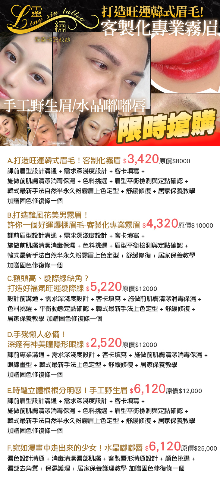 A.打造旺運韓式眉毛!客制化霧眉 / B.打造韓風花美男霧眉!許你一個好運爆棚眉毛-客製化專業霧眉 / C.額頭高、髮際線缺角?打造好福氣旺運髮際線 / D.手殘懶人必備!深邃有神美瞳隱形眼線 / E.時髦立體根根分明感!手工野生眉 / F.宛如漫畫中走出來的少女!水晶嘟嘟唇