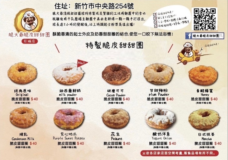 歷經多年的研發及改良,終於造就這般頂級的極致口感,外層酥脆可口、內裡奶香四溢,以最純粹的美味帶給您非凡至上的味覺饗宴,優良的品質一試便知,嚴選的原物料在師傅的巧手之下搖身變成圓潤小巧的人氣點心,再配上經濟實惠的銅板價格,強烈的魅力簡直難以抗拒,不如現在就趕緊出發前往,將好吃又療癒的甜甜圈通通帶回家!