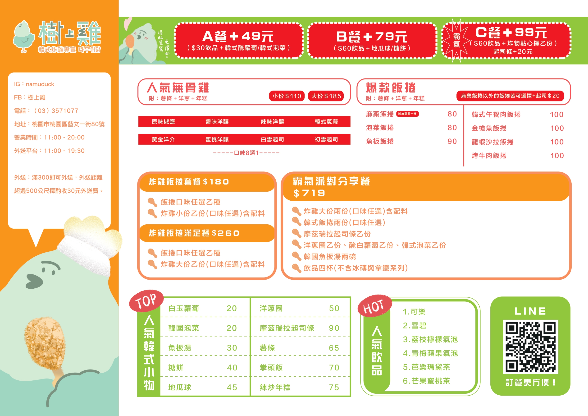 【樹上雞-韓式炸雞】以招牌馬卡龍色裝潢的店面,但凡經過肯定被其繽紛可愛的外觀所吸引,店內提供各式各樣的餐點,特別以多種祕方醬料製作而成的炸雞,口味豐富,選擇種類繁多,滿足每位饕客的味蕾,身為韓式炸雞控的朋友一定不能錯過喔!