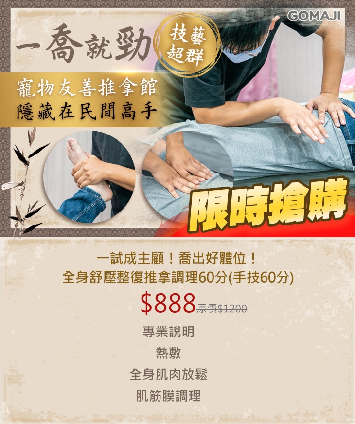 一試成主顧!喬出好體位!全身舒壓整復推拿調理60分(手技60分)