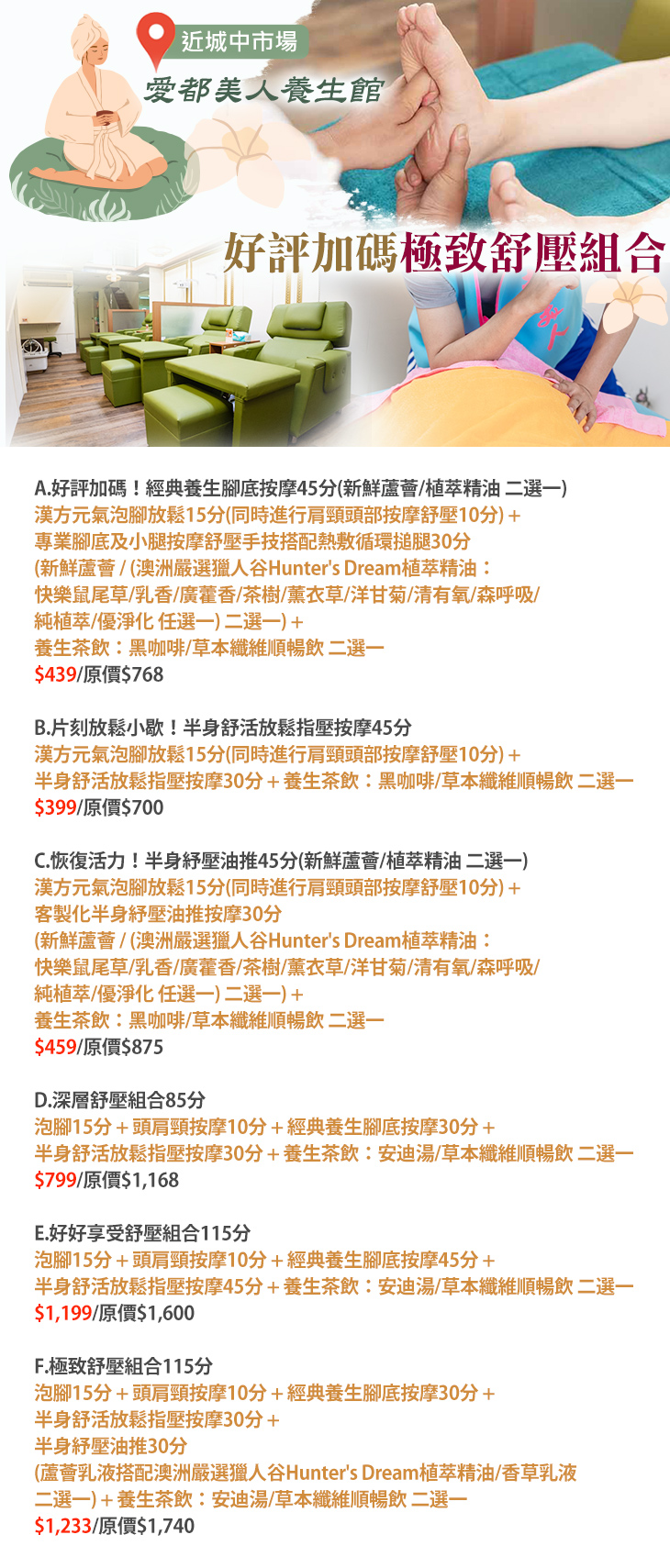 A.好評加碼!經典養生腳底按摩45分(新鮮蘆薈/植萃精油 二選一) / B.片刻放鬆小歇!半身舒活放鬆指壓按摩45分 / C.恢復活力!半身紓壓油推45分(新鮮蘆薈/植萃精油 二選一) / D.深層舒壓組合85分 / E.好好享受舒壓組合115分 / F.極致舒壓組合115分
