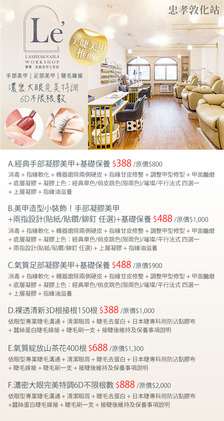 A.經典手部凝膠美甲+基礎保養 / B.美甲造型小裝飾!手部凝膠美甲+兩指設計(貼紙/貼鑽/鉚釘 任選)+基礎保養 / C.氣質足部凝膠美甲+基礎保養 / D.裸透清新3D根接根150根 / E.氣質綻放山茶花400根 / F.濃密大眼完美特調6D不限根數