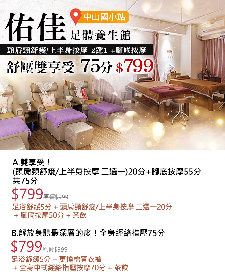 A.雙享受!(頭肩頸舒痠/上半身按摩 二選一)20分+腳底按摩55分共75分