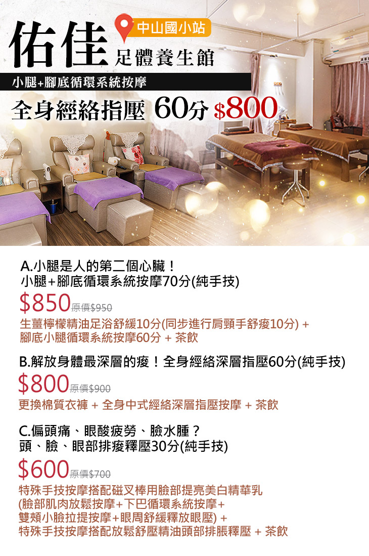 A.小腿是人的第二個心臟!小腿+腳底循環系統按摩70分(純手技) / B.解放身體最深層的痠!全身經絡深層指壓60分(純手技) / C.偏頭痛、眼酸疲勞、臉水腫?頭、臉、眼部排痠釋壓30分(純手技)