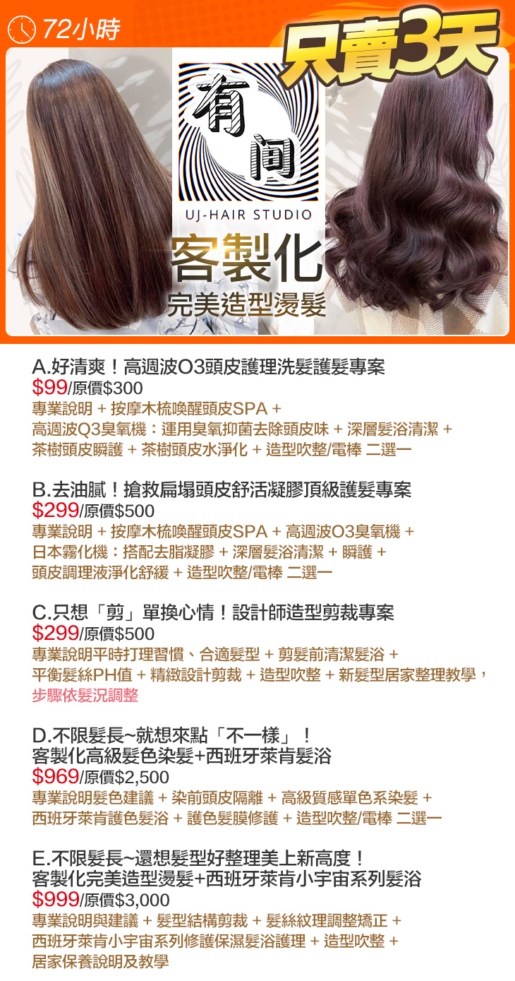 A.好清爽!高週波O3頭皮護理洗髮護髮專案 / B.去油膩!搶救扁塌頭皮舒活凝膠頂級護髮專案 / C.只想「剪」單換心情!設計師造型剪裁專案 / D.不限髮長~就想來點「不一樣」!客製化高級髮色染髮+西班牙萊肯髮浴 / E.不限髮長~還想髮型好整理美上新高度!客製化完美造型燙髮+西班牙萊肯小宇宙系列髮浴