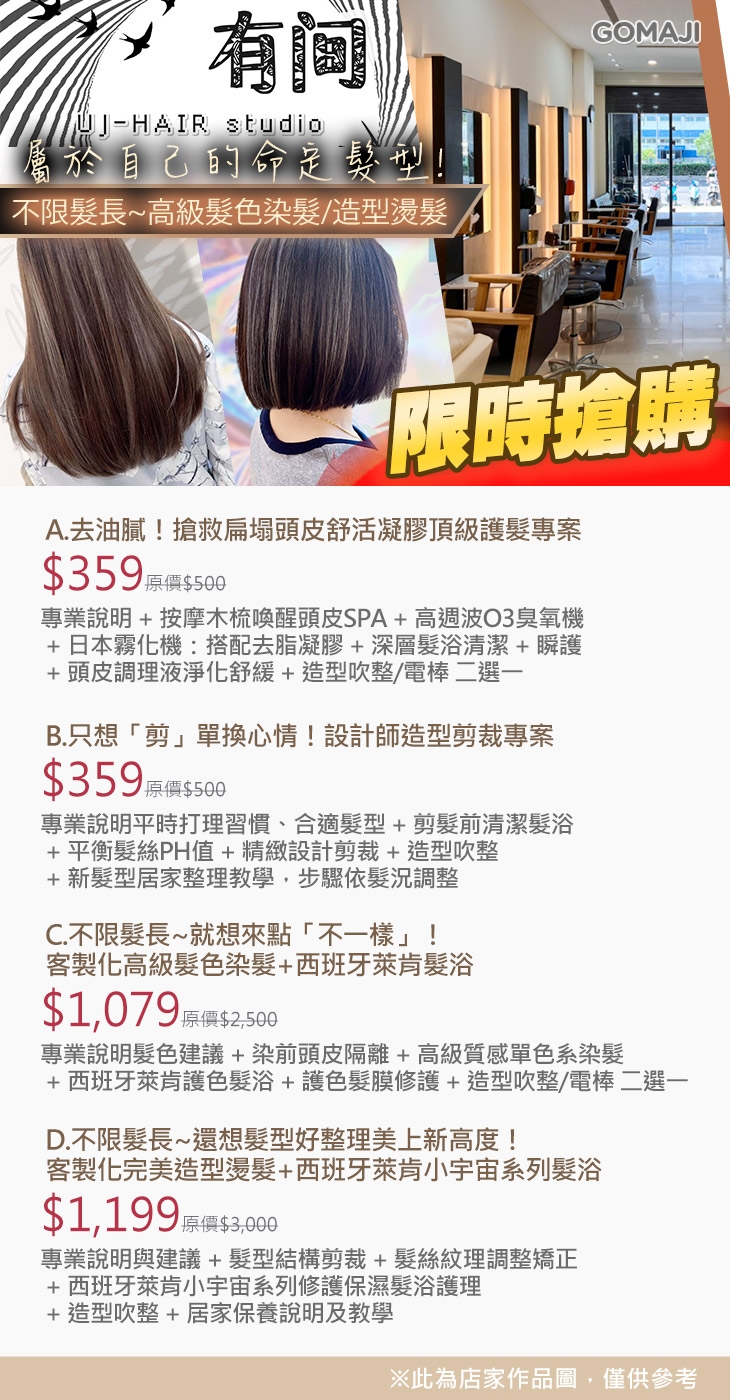 A.去油膩!搶救扁塌頭皮舒活凝膠頂級護髮專案 / B.只想「剪」單換心情!設計師造型剪裁專案 / C.不限髮長~就想來點「不一樣」!客製化高級髮色染髮+西班牙萊肯髮浴 / D.不限髮長~還想髮型好整理美上新高度!客製化完美造型燙髮+西班牙萊肯小宇宙系列髮浴